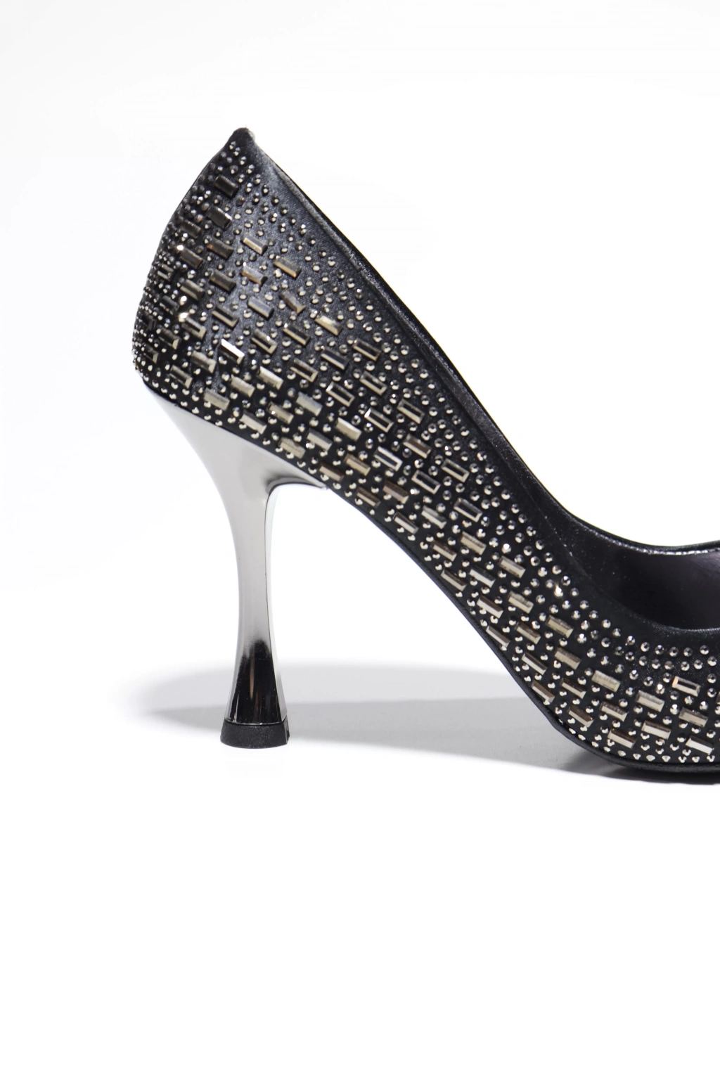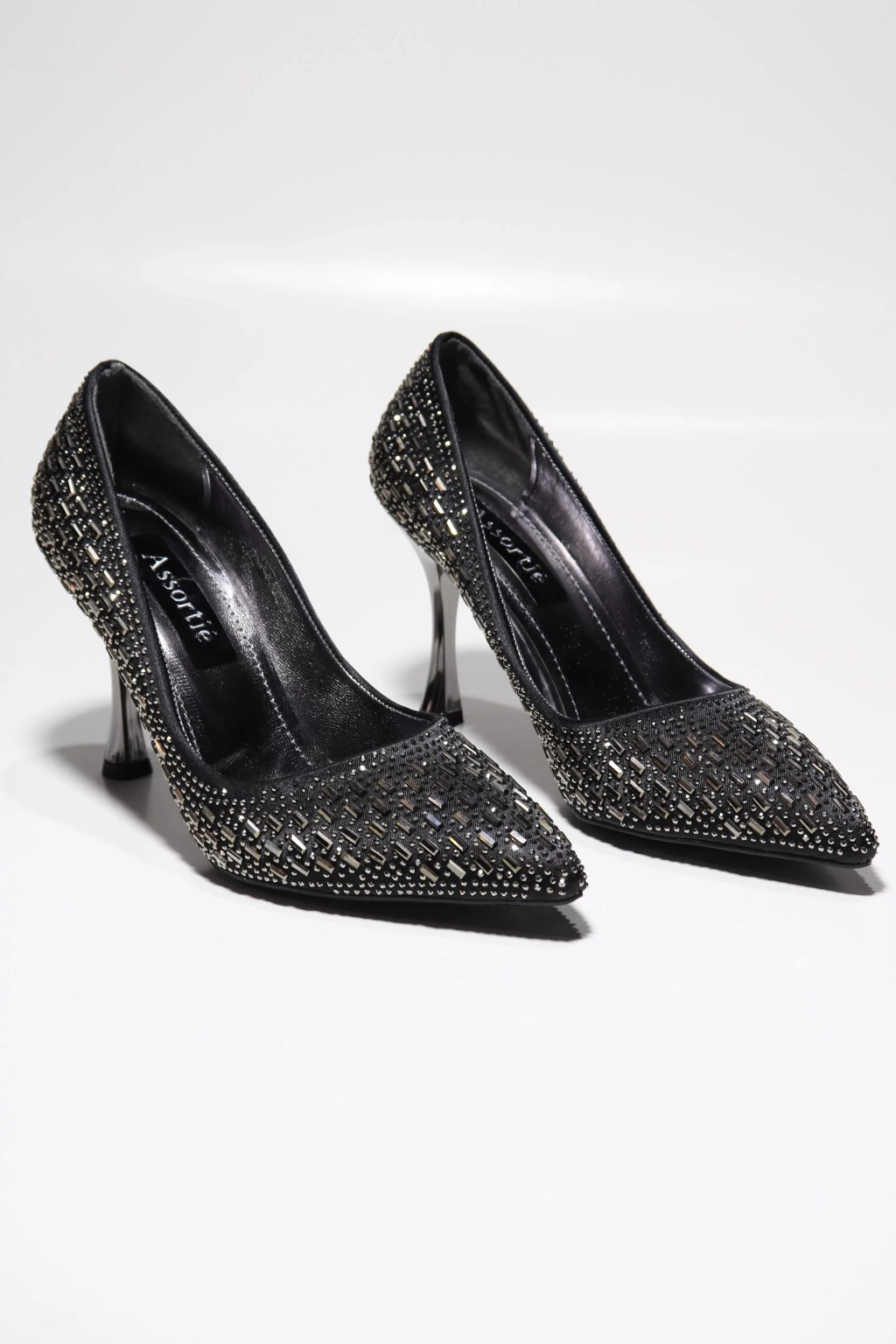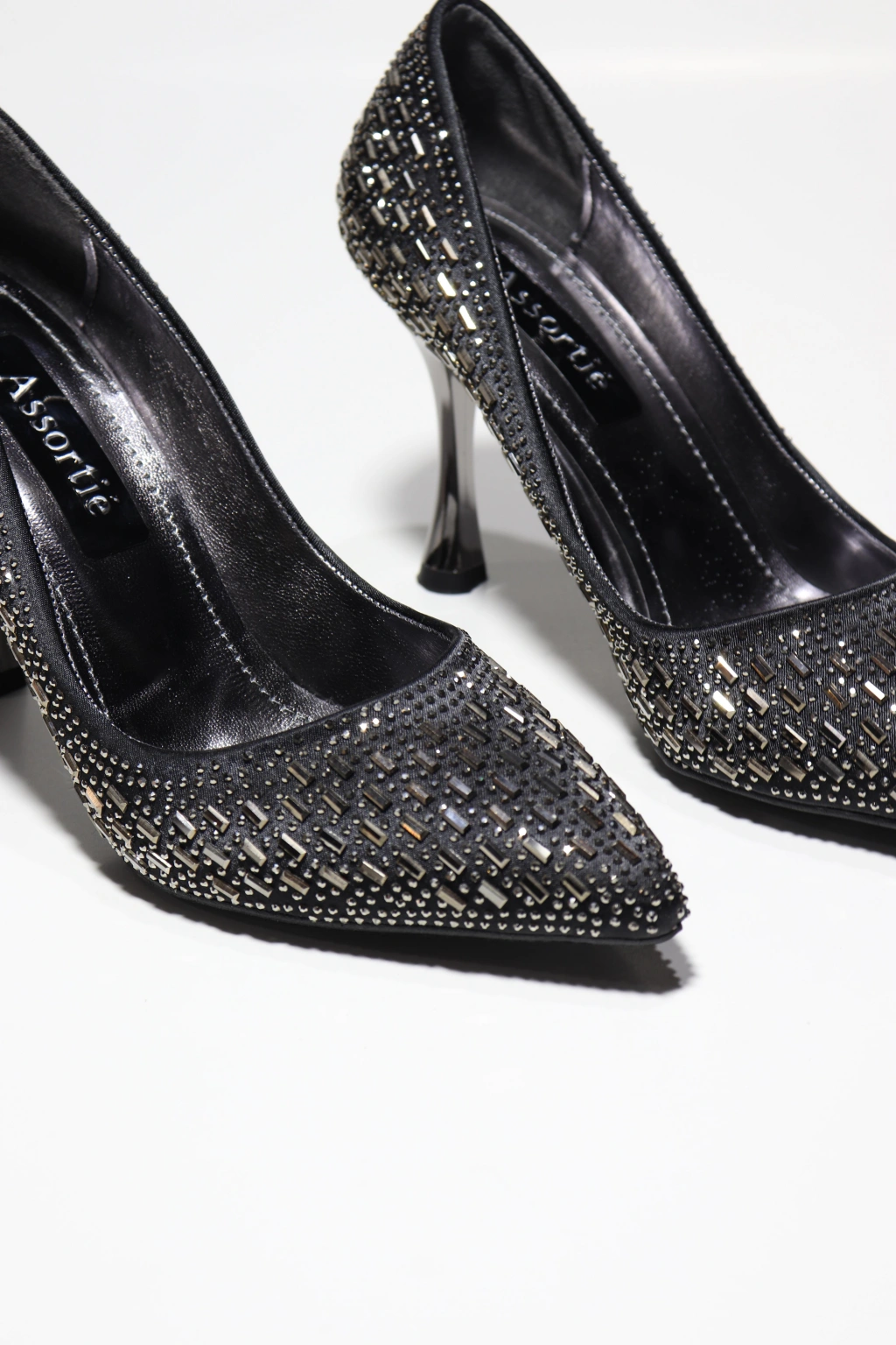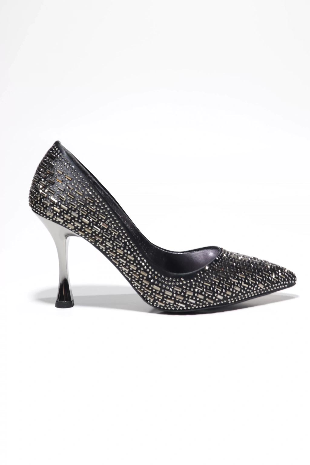 Zarafeti ve parıltıyı bir arada sunan bu siyah topuklu ayakkabıyla özel anlarınızda göz kamaştırın. Ayakkabının tamamını kaplayan minik taş işlemeleri, her adımınızda büyüleyici bir ışıltı yayar. Sivri burun detayı, ayağınıza zarif bir görünüm katarken, ayna gibi parlak ve kavisli topuk tasarımı modern bir dokunuş sunar.